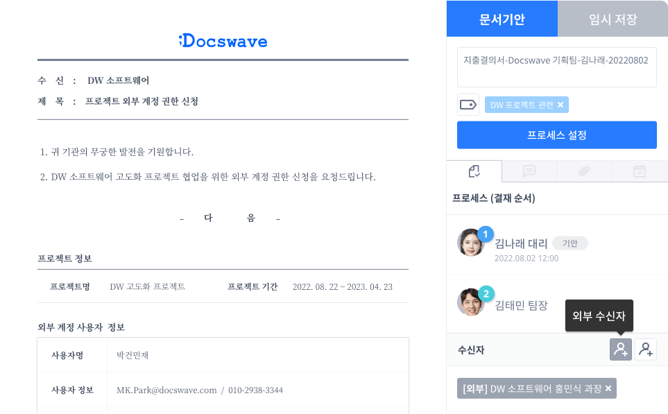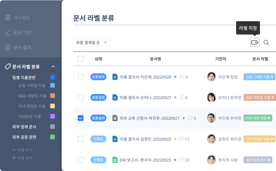 라벨 기능을 활용하면 문서분류가 편합니다. 닥스웨이브를 사용하면서 우선 직원들의 만족도가 높아졌고요. 서류를 찾는 작업이 없이 자동화가 되니 업무 효율이 상승하였습니다.
