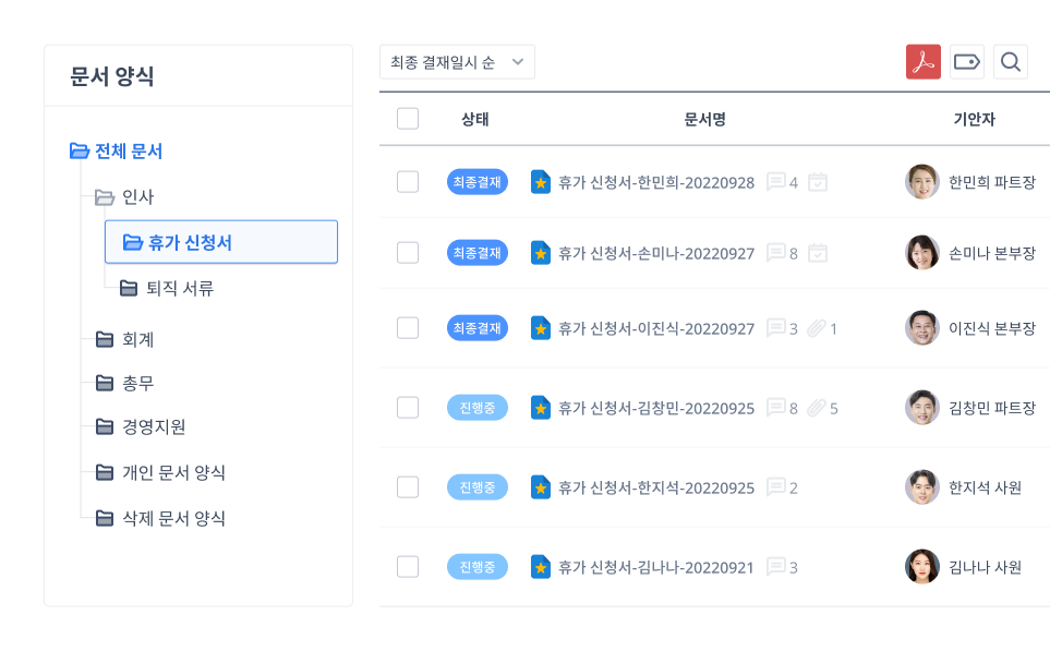 병원 내 보고서, 기안서 등을 카테고리별로 빠르게 검색할 수 있고, 기안시